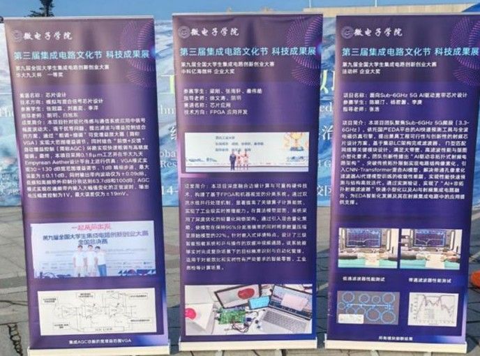 成果展示显佳绩 科创成果展区汇聚了学院各年级学生的创新实践作品。模拟与混合信号芯片设计、FPGA应用开发、AI驱动宽带芯片设计等一系列优秀的科创作品惊艳亮相。这些凝聚着智慧与汗水的成果,不仅吸引了大量同学驻足观看,更成为了激发创新灵感的火种。