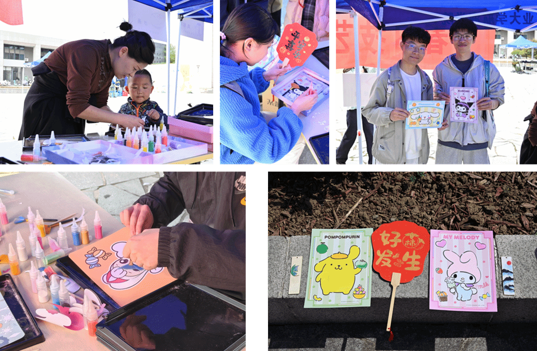 纸扇绘制区笔墨飘香,梅兰竹菊的清雅与校园地标剪影相映,一笔一画间,传统书画艺术与校园情怀深度交融;